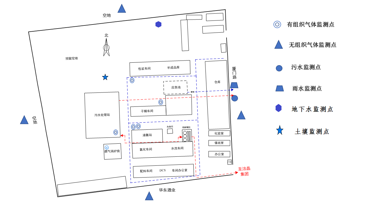 污水總排口一個,位于廠區(qū)東側(cè)外墻外,大氣排放口共5個,其中污水處理1個,氯化2個,干燥1個,包裝1個 |